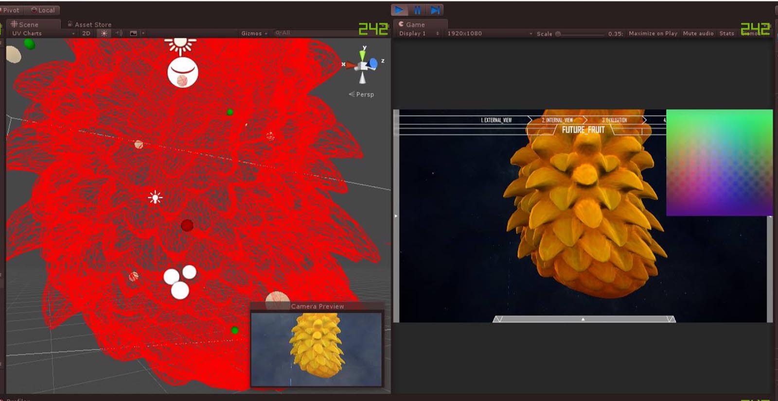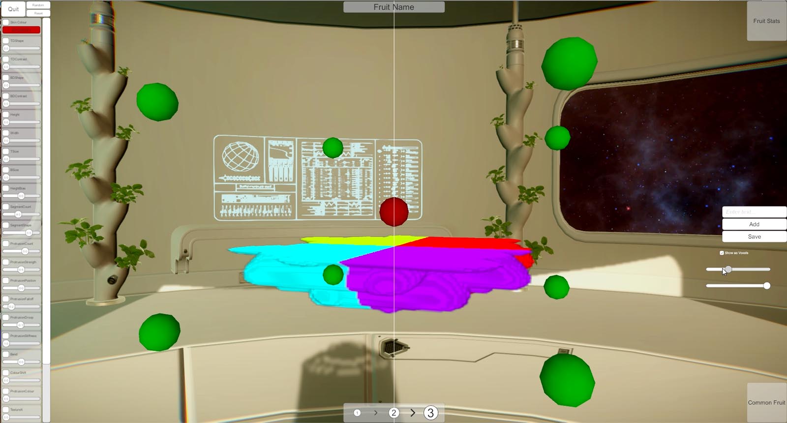 Deb applied game design techniques to develop Future Fruit, a food simulation and printing system. From a Virtual BioLab players can design their own unique future fruit – deciding on it’s shape, texture, colour, protrusions, segments, taste and more – before sending it to a 3D printer modified with a custom mixing container filled with edible and nutritious materials. The custom controls are based on actual plant development processes and were designed with plant biologist experts from Plant and Food NZ. The printable agar solution was developed by materials scientists in consultation with nutrition researchers. Players can access the BioLab through desktop and touch screens or enter into the VR version where you can walk around the lab and experiment with 3D lab controls.