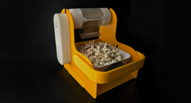 GustaCine is an innovative cross-modal cinematic experience that allows viewers to experience and savor cinematic moments through the gastronomic pleasures of multi-flavoured popcorn. GustaCine alters the flavours of popcorn in real time with the use of evocative seasonings. Each seasoning is carefully crafted to respond to emotions represented on screen. Through the unique interplay of flavours and emotions, GustaCine creates an authentic signature of the movie narrative, leading to an enhanced appreciation of food and heightened mindfulness of textures and tastes. The experience contributes to the sustainable food-service design and richer cinema-watching experience.
