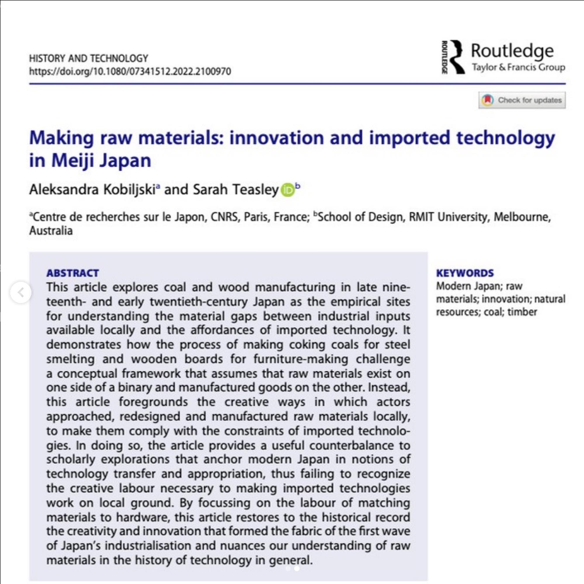This project, published as a peer-reviewed article in History & Technology, explores coal and wood manufacturing in late nineteenth- and early twentieth-century Japan as the empirical sites for understanding the material gaps between industrial inputs available locally and the affordances of imported technology. The article powerfully critiques existing accounts of technology transfer and foregrounds the creative ways in which actors approached, redesigned and manufactured raw materials locally, to make them comply with the constraints of imported technologies and to make imported technologies work on local ground. By focussing on the granular labour of matching materials to hardware through materials and process experimentation, this article nuances our understanding of raw materials in both history and localised applications of emergent materials and tech today.